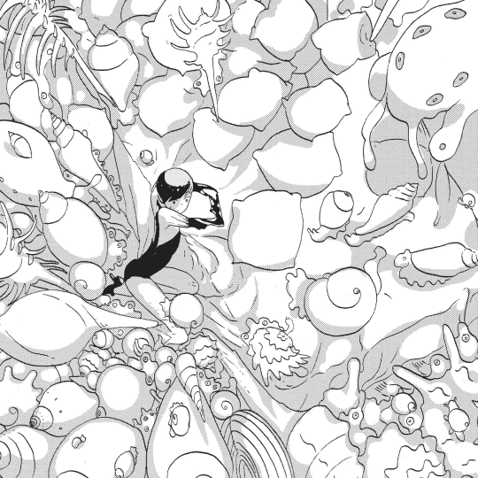 Si ya elogiaba a la autora por la atmósfera de extrañeza que lograba crear mediante su dibujo en algo tan cercano para nosotros como es la Tierra, lo de la luna ya es como para echarse a llorar. Esas estructuras geométricas me vuelven loco y los ligeros toques de worldbuilding (el aceite mineral, la comida y los cubiertos, las sillas...) me venden un espacio muy distinto al que Ichikawa nos tenía acostumbrados tantos tomos. Sin embargo, el ritmo de la serie vuelve a ir un poco en su contra: al final, siento que no he visto suficiente de la luna y me pregunto durante medio tomo cuándo volveremos.