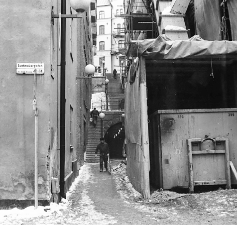 J: Ja, då först sneddar jag över Luntmakargatan själv och ser honom springa trappan med två, tre trappsteg i taget.