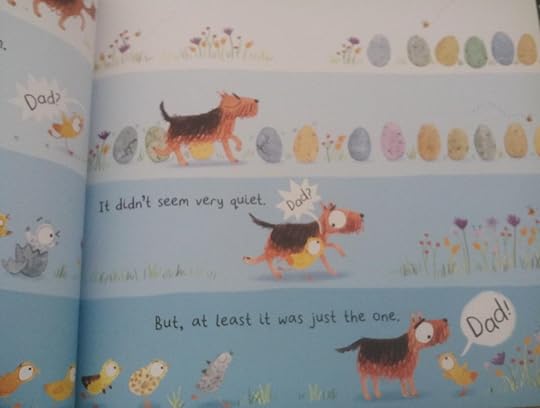 Ralph enjoys a quiet dog's life walking until he passes an egg that cracks open. The story follows Ralph as more and more eggs open and he becomes an inadvertent Dad. As Dad he must feed them and bathe them, and teach them to swim, and put them to bed. But the ending has a twist that is fun and relieves Ralph after a lot of hard work and presents him with a new surprise flock of challenges. A fun twist ending to read aloud to children.