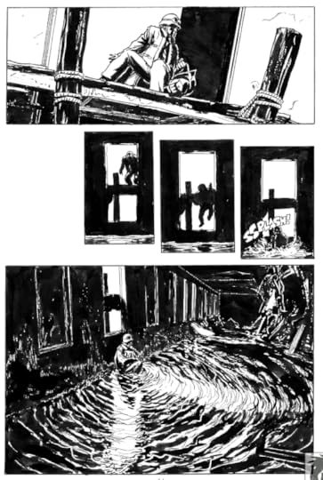 But the art is spectacular in its detail and also in its messiness. I think with a story in a flooded world, the term "muddy" isn't necessarily a perjorative to describe the artwork. We spend so much time -- almost that entire first twenty pages -- without there being any dialogue and wide panoramas of the skeletons of high-rises protruding from the mire of a flooded planet. That, I think, makes this book recommendable.