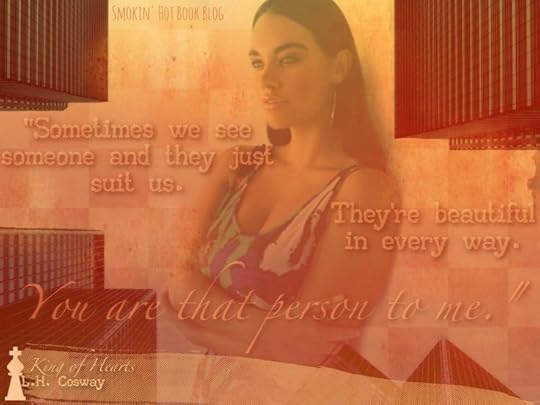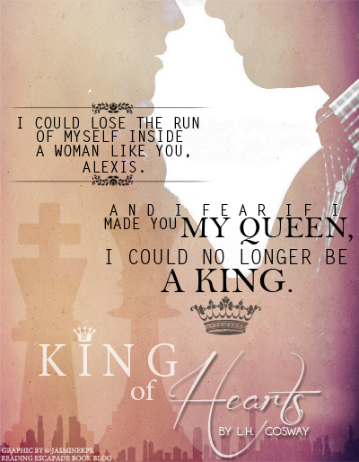 This story is beautifully written. L.H. Cosway has given readers some vivid characters to root for. I love smart, witty heroines and I found these qualities in spades with Alexis. In King we almost have two separate characters: the “Before” King and “After” King. It’s difficult to decide which I liked more: the confident, driven, compassionate man or the tortured, vulnerable, artistic soul. One could argue that both men are flawed, although in different ways and my heart ached for each of them.