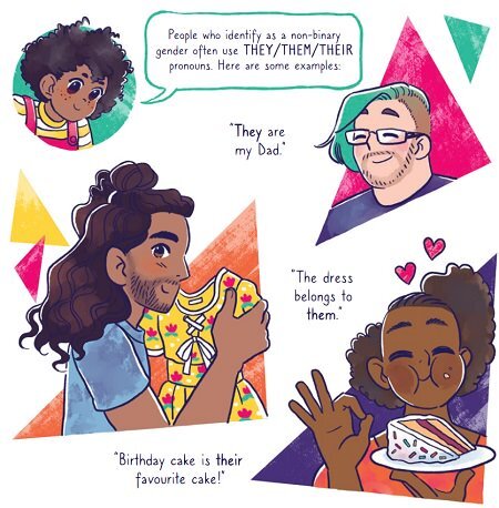 There is a discussion of various ways of identifying as non-binary: agender, bigender, genderqueer, genderfluid “. . . you should never assume anyone’s gender simply based on how they look.” Three examples of sentences using they/them/their pronouns for individual, non-binary people