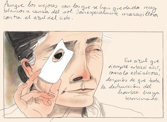 The bones do not symbolize death to me. They are shapes that I enjoy ... They please me. And I enjoy them very much in relation to the sky. But it's very easy to always be having a bone with a blue hole in it. So I have a reddish bone with a yellow sky. And that isn't too bad either. Although the best are the ones that have turned white from the sun. They were most wonderful against the blue ... that blue that will always be there as it is now after all man's destruction is finished. - extract from a letter by Georgia O'Keeffe, quoted in this book.I've read several books about the American artist Georgia O'Keeffe (1887-1986) and some of the related photo albums by her husband Alfred Stieglitz (1864-1946), and I found that Maria Herreros captured her life and spirit beautifully in the space of these 128 pages of minimal words with graphic novel art. The biographical authenticity is enhanced by the text using a considerable amount of quotes from O'Keeffe's own letters, primarily to Stieglitz, but also to others.