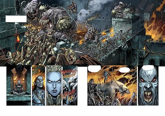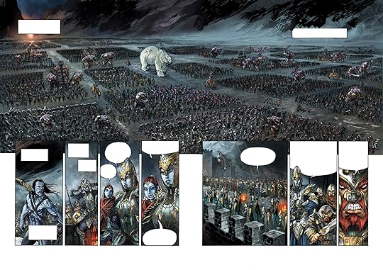 Take a Battle of Helm's Deep from The Lord of the Rings, add parts of battle from Legend and sprinkle with World of Warcraft and the army of undead from far North of A Game of Thrones and you'll get an idea what is waiting for you in this volume of great French fantasy series, Elves. The ghoul army of Elven Necromancer Lah'saa is coming, growing ever stronger, and Blue Elves with their Human allies are making a stand at the impenetrable fortress of Castennroc. Lanawyn and Turin are there. but there is also an old acquaintance from another series, Dwarves. The one and only, Redwin, who we've first met in Redwin of the Forge. It's a fast-paced story with great art and amazing panels, especially wide ones, with several plot twits and a bitter end and a promising cliffhanger. This series deserves more recognition.