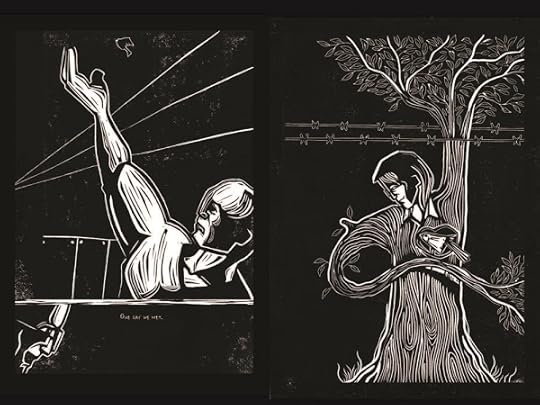 The flights of the bird the author/artist creates to make the stories of others come alive are beautifully imagined. The linocut technique carries through the sense of enclosure, of stasis within a field; the bird's flights aren't escapes but reminders of the nature of imprisonment, confinement. It is this essential feature of the story that I found least convincing, though. I wasn't sold on the narrative device providing an urgently needed contrast to the overall looming, enclosed tone of the book. The awful entanglement of the body in the emotional and mental space of imprisonment, confinement, comes through more clearly than ever as the author presents us with the stories of other Palestinians, those not imprisoned with him, as they navigate the awfulness of never being allowed a sense of Home or even of safety in this place they, and their ancestors before them, once were masters of their own fates within.