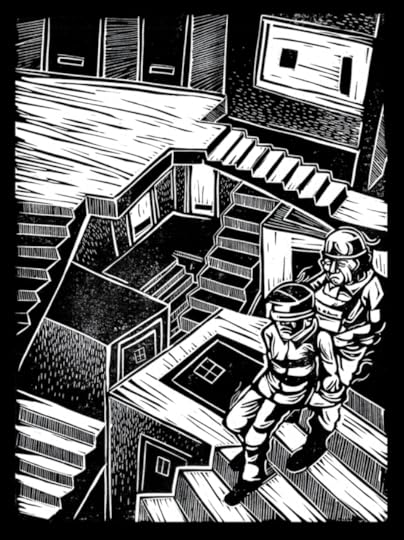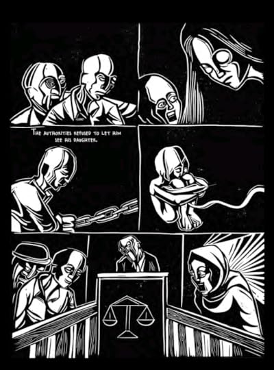 My Review: The author/artist, whose lived experience this graphic novel is born out of, made a beautiful work of art out of suffering. The linocuts used to create the illustrations are truly brutal, absolutely unsparingly blocky and confining, and that is the essence of the story he is telling us in his words and images. It's my worst nightmare, claustrophobia, made in art. There's nothing worse than the feeling of being TRAPPED, of having no agency in the workings of your own world...you exist that way, you don't live. In the beginning of the book, you're not told what happened to bring the author/artist into an Israeli prison. We're just...in there. We are, like him, forced to experience imprisonment, though we're unaware of why and presumably he is...there's a line that a guard shouts at him about wanting to become a martyr, so I can deduce from that there is a violent act in the man's past. Or the planning of one, or just the suspicion of the planning of one...societies that exist inside a conflict paradigm are noticeably more paranoid than ones that don't.