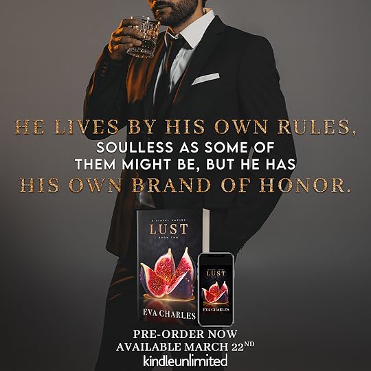 Antonio and Daniela's sensual, dramatic and emotionally wrecked story continues in Lust by Eva Charles. This dark mafia arranged marriage romance is full of jaw dropping twists and mindblowing secrets. The chemistry is intoxicating and on fire. Antonio is the perfect alpha antihero and with every fierce step, Daniela is showing how perfect she is for his dark empire.