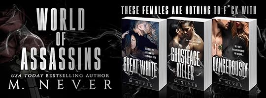 Great White catches your attention from the first line of text, the first scene where we meet the person Dove used to be. A chance run in with 2 of my favorite characters changes her life forever. Flash to the present day, we meet Tate who gets a glimpse of the woman Dove has become up close and personal. She lays him on his ass, both literally and figuratively. He’s a goner. As the story unfolds, Tate and Dove become ever more entwined in each other’s lives. Tate pushes and Dove fights him tooth and nail to stay the hell out of her life. She is a loner by choice and for survival, a lone shark. Tate refuses to be kept at arms distance. There are profound moments between our characters as the pages turn. There is intense sexual attraction, flirting, humor, humility, and yes of course, scenes that will have you fanning yourself. I will not spoil anything, but the ending is going to come out of nowhere and bite you in the ass. I am very skilled at predicting what will come next and I had not a single clue. Be warned, there are sharks in the water. This is another amazing addition to M. Never’s World of Assassins series. I have loved the bold and charismatic women and the men who love them in this series. These stories are full of plot, characters you want to know better, and devious twists and turns that will have you wanting to throw your book. Don’t do it. You’ll want to know what happens next. If you have not yet checked out the other titles in the series, read them now! Ghostface Killer and Dangerously are tales of other strong women who rule their lives and survive anything that comes their way.