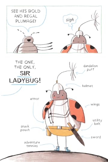 With Corey R. Tabor's 2022 early reader graphic novel Sir Ladybug, the delightfully anachronistic (at least for modern times) and gentle knight in shining insect armour main protagonist Sir Ladybug is textually and illustratively shown by Tabor as being approached and asked for help while on a morning excursion of exploration and discovery with his friends Pell (his at times a bit overly enthusiastic pill bug herald) and his trusted steed Sterling (naturally not an actual horse or pony, but instead a snail) by a beetle whose caterpillar friend needs rescuing from a monster, but that when Sir Ladybug and his entourage decide to face the supposedly deadly and hideous creature and to rescue the caterpillar, the monster of Sir Ladybug turns out to be just a very hungry black-capped chickadee in search of a meal (and yes, Sir Ladybug does indeed show and point out that chickadees do in fact and naturally so consume bugs, caterpillars and the like as food).