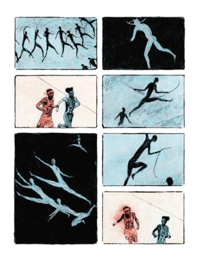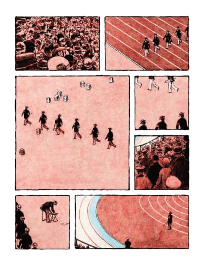 I thought this was an excellent example of sequential art. I imagine some of the panels could be made into an effective flip book—in a way it was like watching a documentary of the 1928 Olympic marathon runners. I loved the low-color images, and the contrast of running with scenes of the wind in fields, horses running through a field, scenes of a factory, and cave art were beautiful. The historic record this was based on made a good story, and it was powerfully told.