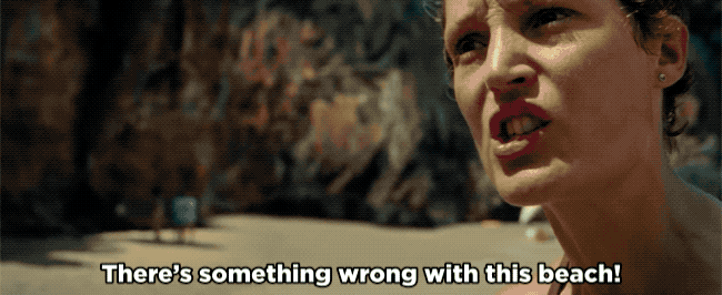 A man hiding on the cliff face of a beach watches a young woman skinny dip in the sea. A couple of families show up early to the beach to set up their stuff before the crowds appear and one of them discovers the young woman floating face down in the sea - or at least she was young, not now. Slowly as more people appear on the beach they notice strange things happening to the kids. The three year old boy suddenly looks much older, at least six, while his five year old sister is taller and beginning puberty. They realise that the beach is somehow making them all age incredibly quickly but find that they can't leave - they're enclosed in some kind of force field. And at the rate they're aging, it looks like everyone's going to die there.