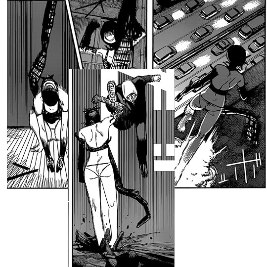 El hombre motosierra cabalgando un tiburón, una bomba sin bragas pero en el siguiente panel con ellas (ay, Fujimoto), un ángel salvando a otro ángel y mi waifu saliendo de entre un montón de ratas (ay, qué asco, Makima).