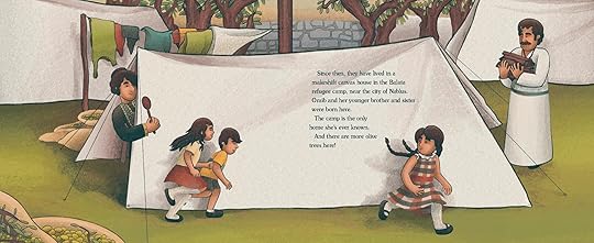 It's so heartbreaking to read this one and see how Palestinians are being banished from their land because of the "war". The line "The camp is the only home she's ever known" is proof that so many people don't even have a place to live permanently, like Oraib. But I admire how Oraib stays together with her family, and they always have each other.