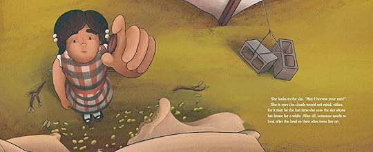 The dramatization of asking the earth and sky when planting a seed upon their departure, didn't make much sense to me. It is noted there are olive trees already there, the illustrations show the ground littered with seeds that were to be planted had they stayed, so why not have the little girl pocket some of the seeds to take with her wherever they go. That is after all what the mother is doing at the beginning. Why not have the little girl invest in the cause herself and share in that ownership that they will always endure and prosper. The personification of the earth, sky and rain also doesn't seem to fit the flow of the story, so much is internal observation and reflection of the main character, that this seems like an attempt to bring it back to a child's level that instead just reads disjointed.