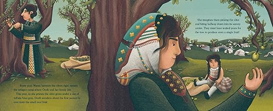 Oraib loves the olive trees that grow outside the refugee camp where she lives. Each harvest, she and her mama pick the small fruits and she eagerly stomp stomp stomps on them to release their golden oil. Olives have always tied her family to the land, as Oraib learns from the stories Mama tells of a home before war.