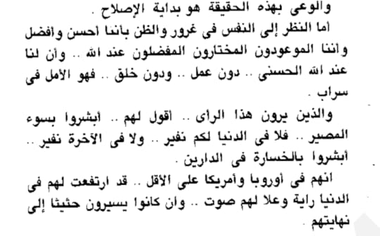 الكتاب عادي بل عادي جداً .... بعض من العبارات والخاطرات الدينية. ولكن الذي لم أفهمه هو سبب فصله الأول في اللغات !! (شخصياً لم استفد سوى من بعض الملاحظات في هذا الفصل فقط !) الكتاب قصير أعجبني فيه عبارتين: ١- حينما أشار أن الإسلام روعته "بدنميكيته" وتكيفه مع الحياة وأن الإسلام هو منهج عمل لا دين نصوص صلبة جامدة يجمد بها فكرنا وكل همنا ومازل للأسف (هل البرغوث نجس... بول البعير حلال أم حرام .. الموسيقى... الشعر......الخ) ٢- حينما أشار بأن الغرب رغم انحطاطه الأخلاقي ربما يبقى المتفوق ونحن للأسف نحسب أنفسنا بمنئ عنه رغم أننا في الطريق للحاق به وليس بيننا وبينه الإ بضعة درجات ! بل ونظن أن بدعائنا وصلواتنا """فقط""" سيخسف الله بالغرب ويحمينا من الخسف لأننا "نلبس قشور" دينه !