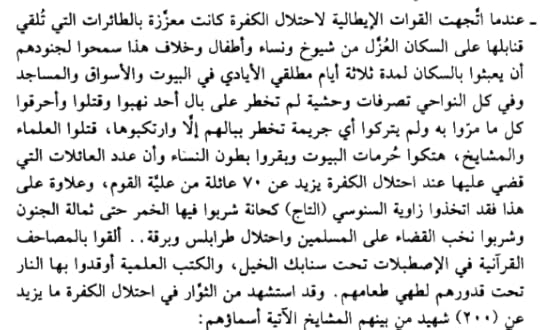 حاولوا معه الذي نجح بامتياز مع غيره.. ابقائه بالسلطة والمنصب ولكن بشروطهم فرفض رحمه الله وتصدى لهم.. فقرر العفن الإيطالي الظهور.. استباحوا الارواح والاعراض والاراضي .. فقتل بشع واغتصاب متوحش وطرد قاسي .. نفس الموال القذر الذي حصل بالأندلس والصين الغربية وبورما و جنوب روسيا و البوسنة وصربيا وفلسطين ولبنان و..و .. أي بلد يقاوم محتل يعادي الإسلام