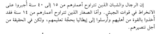 ما قرأته في هذا الكتاب مما فعله المتطرفون الإيطاليين المتثمثلين بالحزب الفاشي شيء لا يصدقه العقل الإنساني العاقل , إن ما فعلته الحكومة الإيطالية آن ذاك أشبه بالمجازر الكبرى و الإبادة المرعبة ! القتل عندهم أشبه بالتحية التي يلقونها على المواطن الليبي فحينا يرمونه بالرصاص , وحينا يقذفونه من الطائرة ليسقط على الجبال و يتدحرج و يتقطع إربا إربا أمام ناظر أهله , و إن كان هذا الليبي جنينا فيبقرون بطن أمه لينهبوا منه حق الحياة !