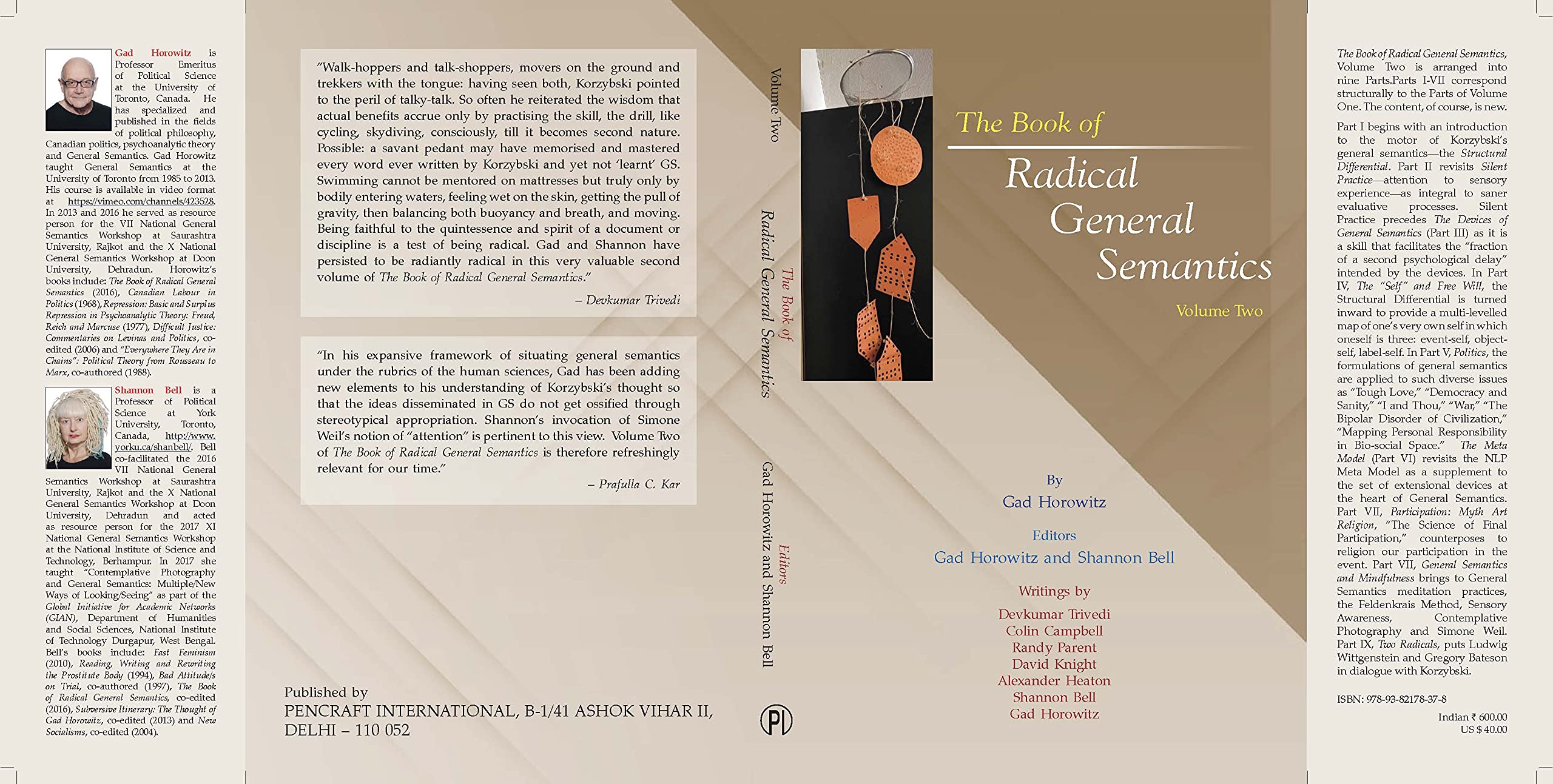 The Book of Radical General Semantics, Volume Two is arranged into nine Parts.Parts I-VII correspond structurally to the Parts of Volume One. The content, of course, is new. Part I begins with an introduction to the motor of Korzybski’s general semantics—the Structural Differential. Part II revisits Silent Practice—attention to sensory experience—as integral to saner evaluative processes. Silent Practice precedes The Devices of General Semantics (Part III) as it is a skill that facilitates the “fraction of a second psychological delay” intended by the devices. In Part IV, The “Self” and Free Will, the Structural Differential is turned inward to provide a multi-levelled map of one’s very own self in which oneself is event-self, object-self, label-self. In Part V, Politics, the formulations of general semantics are applied to such diverse issues as “Tough Love,” “Democracy and Sanity,” “I and Thou,” “War,” “The Bipolar Disorder of Civilization,” “Mapping Personal Responsibility in Bio-social Space.” The Meta Model (Part VI) revisits the NLP Meta Model as a supplement to the set of extensional devices at the heart of General Semantics. Part VII, Myth Art Religion, “The Science of Final Participation,” counterposes to religion our participation in the event. Part VII, General Semantics and Mindfulness brings to General Semantics meditation practices, the Feldenkrais Method, Sensory Awareness, Contemplative Photography and Simone Weil. Part IX, Two Radicals, puts Ludwig Wittgenstein and Gregory Bateson in dialogue with Korzybski.