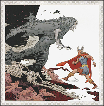 In this volume, Russell adapts several stories. We see the death of the God of Poetry by the hands of two dwarves, and how the Odin gets revenge on them. In another story, Thor and Loki travel to the land of giants and are put through several tests of their abilities that turn out to be major illusions. Loki mistakenly gives away the goddess who guards the Apples of Immortality and has to get her back before he's tortured by his aging family. We follow Frey and how he found and married his wife, but gave up the sword that might save him during Ragnarok.