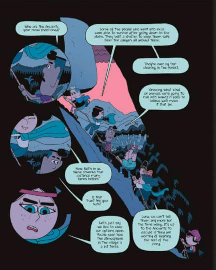 The ending definitely sets up for the next volume, which I am very much interested in reading. The art style feels very influenced by thin-line animation, and the layouts are easy to follow. The lookout point, especially, is highly stylized and breathtakingly rendered. This was a fun way to kick off a cool speculative fiction comic for kids that still realistically tackles the challenges they face as ordinary kids even in extraordinary circumstances.