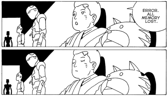 There's a certain comfortable melancholy that pours out of nearly every page of this book, emotional moments implied in such subtle ways as most of the characters we interact with are robots who are able to go through these incredibly existential situations without any obvious signs of emotional distress. But then there are these quiet, almost but not quite internally looking moments we are forced to wonder if that really is the case, or if there is some inner conflict, a sense of longing or loneliness hidden just beyond the inscrutable expressions of these artificial humans.