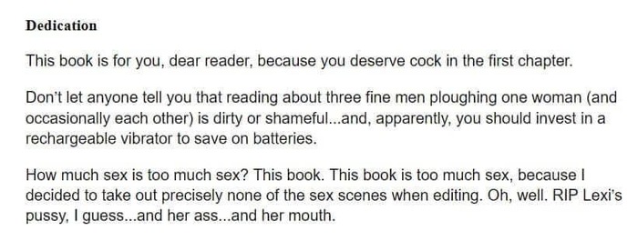 For, like...a couple of hours lol. All I did was innocently post the dedication but somebody couldn't find the thread later in the day and so they posted the pic of it in all the groups and people were trying to find it. I'm sorry, dirty book groups, for sending you on a wild goose chase to find a book I hadn’t even put up for preorder yet!