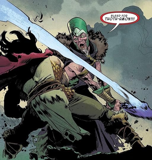 Its such a weirdly well told tale and yeah its switching back between timelines and thats kinda like Aaron's thing and he utilizes it really well here truly showing who Conan is and what it means to be a Cimmerian, really fleshing out the relationship between him and his son and then giving him such great enemies here and also giving a good origin and motivation to Thoth-amon that really makes their rivalry legendary.