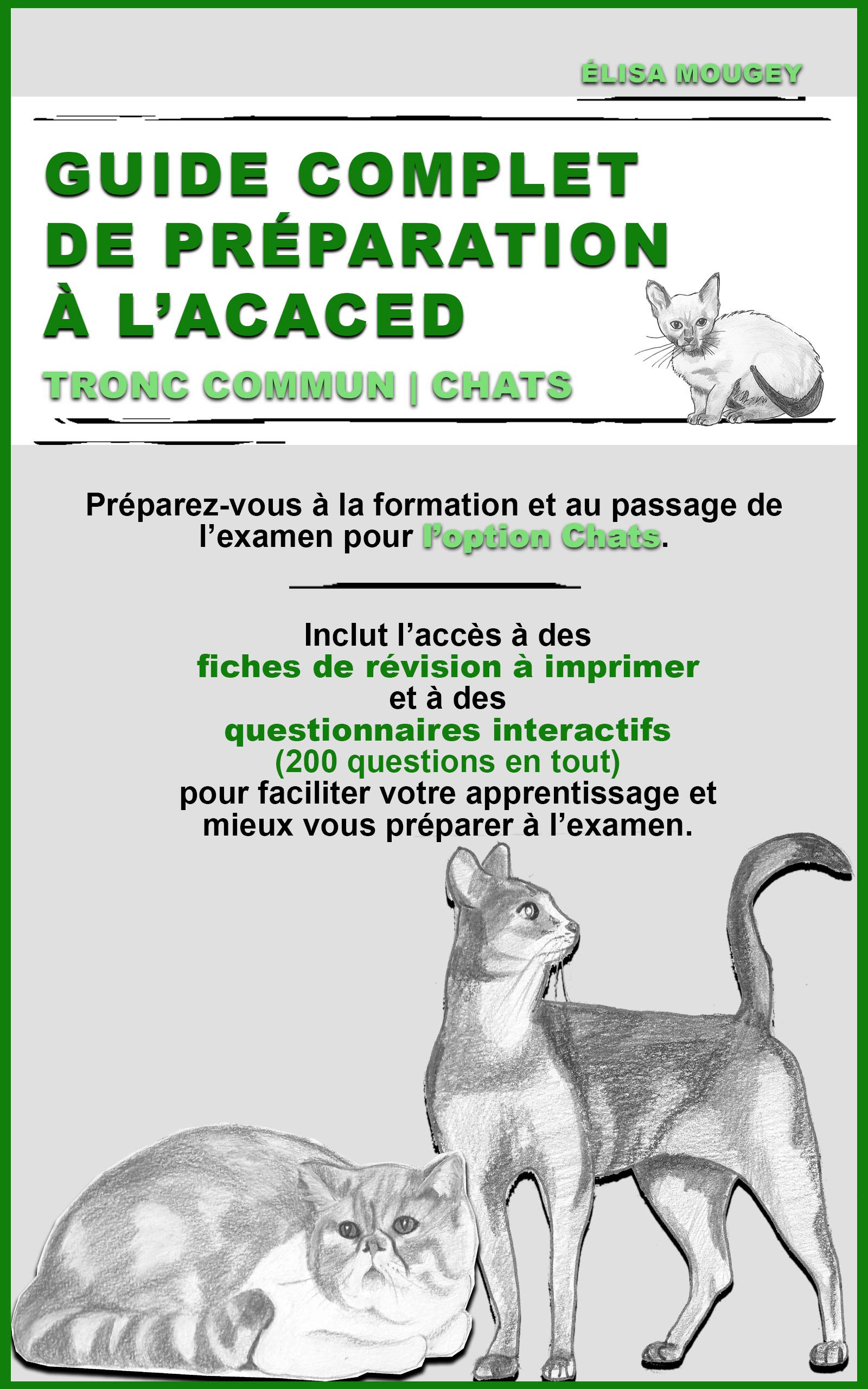 Publié en janvier 2021, édité en septembre 2023Préparez-vous à la formation et au passage de l’examen pour l’option Chats.Ce guide inclut l’accès à des fiches de révision à imprimer et à des questionnaires interactifs pour faciliter votre apprentissage et mieux vous préparer à l’examen.La partie sur le tronc commun est à connaître quelles que soient la ou les options sélectionnées (elle est commune à toutes les espèces et est également couverte durant la formation).J’ai concentré les informations du Tronc Commun sur l’espèce Chat, puisque c’est le sujet d’étude de ce guide, mais j’ai également inclus les références aux autres espèces (espèce chien, principalement), car il est possible qu’elles soient mentionnées dans votre formation.