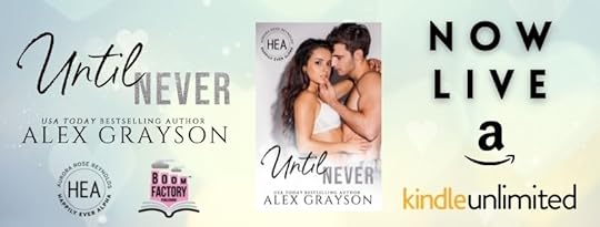The BOOM 💥 is back in the Happily Ever Alpha World and Alex Grayson is the next author up. I've read a book or two by this author before so I was familiar with her words. I'm happy to say this is another amazing addition to this world. Until Never was everything I expected it to be in all the sweet, swoony, and emotional ways. Just wait until you meet Ally and Trent.. they were quite unforgettable in moments.