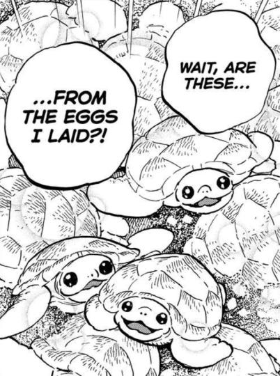 El desarrollo que tienen los personajes sobre su adaptación a una sociedad moderna, donde deben ir entendiendo como lidiar con cada problemática no es una tarea sencilla. Grogu es el ejemplo más concreto, y en quién termina la mangaka centrándose, pero ahí creo que erradica mi mayor problema, son demasiado los personajes que están en la historia, por lo que cuesta bastante darles un digno momento a cada uno. Aun así entiendo perfectamente la búsqueda de conversar con los demás entendiendo y aceptando Fushi que debe dejarlos partir, porque finalmente no es sano revivirlos siempre, porque sus vidas perderían un fin. Luego todo el conflicto que desata en el momento Shonen de la historia, no está mal, pero la verdad no me interesa tanto como la otra parte filosófica de la obra. Por eso, me gustaría que volvería a trabajar de nuevo esas problemas, y no con resoluciones metafóricas y básicas como la de las tortugas, aunque cumplió su objetivo.