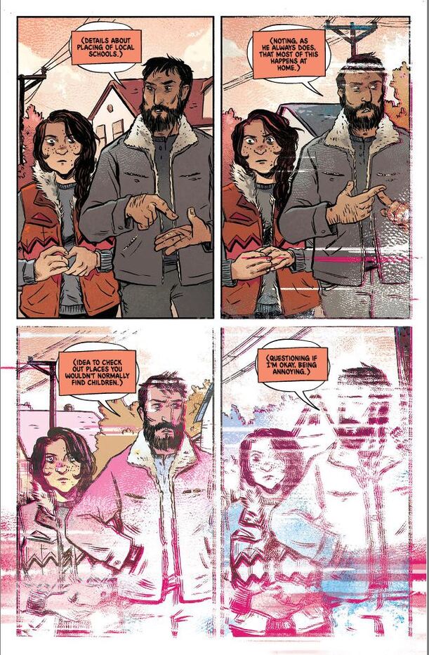 Panels turn to static when Jacey’s mind stops her from remembering horrible memories, and David’s keen sense of smell, when picking up on different people’s scents, is depicted as multi-coloured lines showing those people’s movements.