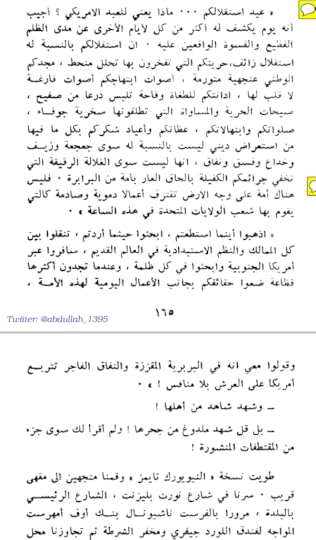 مقطع مفضل : " حين هل الشهر الخامس كان الحرم الجامعي يتوهج بضوء الشمس وبصخب الطلاب الذين راحوا يحتفون بمقدم الدفئ واقتراب العام الدراسي من نهايته. كان العديد منهم قد بدأوا يتخففون من ملابسهم، البعض يلبس الشورت والبعض يسير عاري القدمين مستمتعا بنداوة العشب. بعض الأساتذة خرجوا بمجموعاتهم الطلابية من قاعات الدرس وجلسوا على العشب يكملون درسهم. وأصوات لآلات موسيقية تُضبط وثُعد يسمعها العابر من أمام الكنيسة العتيقة والتي تستخدم كمقر لفرقة موسيقية"ة.