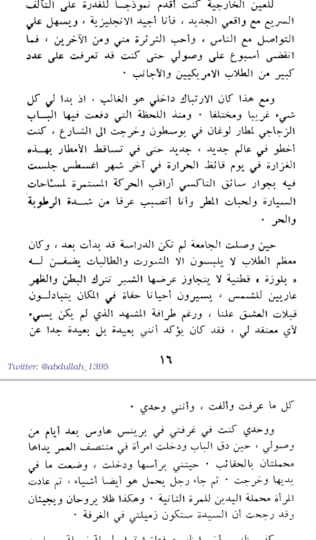 نعيش مع الكاتبة سنتين من غربتها حتى حصولها عل شهادتها و نواكب كل أحاسيسها وخوالجها. الكتاب مليء بالأحداث والمشاعر صورتها لنا الروائية بكل شفافية وشاعرية. مشاعرالغربة،الحنين،الحزن،السعادة،الوحدة،الشعور بالإختناق،التأقلم التمرد،النضال وكل ما يعيشها طالب العلم في غربته.