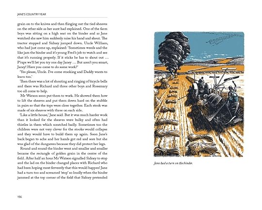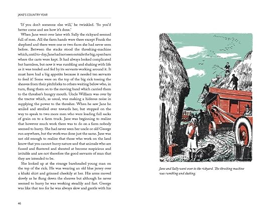 From the moment Jane arrives at Moor End, the farm owned by her Uncle William and Aunt Kate, she notices the differences between town and country life: the lack of traffic noise, the unimpeded view from her bedroom window, the sound of bird song and the daily rhythm of farming life. As time goes by she learns more about animal husbandry and how food is produced. As she discovers, the operation of Moor End Farm still relies largely on manual labour, horse-drawn ploughs and basic farm machinery. The changing seasons are marked by tasks in the farming calendar – sowing, threshing, harvesting – with Jane enthusiastically joining in some of these tasks.