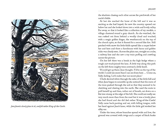 'At last she reached the brow of the hill ... now the country opened out below her and she looked down into a wide and lovely valley ... Still patched with snow the little fields spread like a carpet below her and here and there a farmhouse with barns and golden ricks was clearly seen. Across the plain ran, straight as a ruler, a railway line and she saw a toy train puffing and crawling across the picture.'
