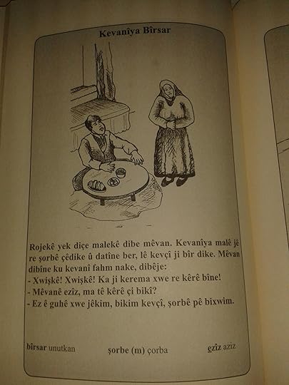 Kitaba gelince, öncelikle konuları anlatış şekli, her konunun başında sözlükçe sonunda alıştırmalar olması, çeşitli eğlenceli, düşündürücü, bazen ürkütücü kısa hikaye, atasözü, bilmecelerin olması kitabın en sevdiğim özellikleri. Bu hikayeler Kürt Sözlü Edebiyatından alınmış ancak kitabın sonunda daha uzun olarak Yazılı Edebiyattan da örnekler var.