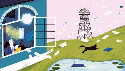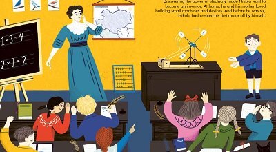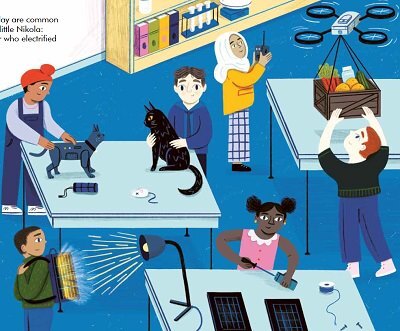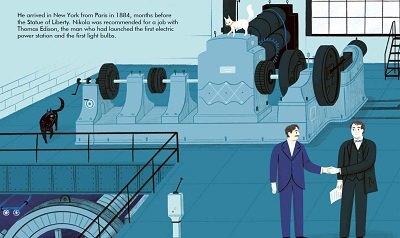 I adore Mostov's little Nikola so much. His cheeky smile, his freckles and his hairstyle is a great fit. His blue outfit is very cute too. But one of the best parts of the illustration is the choice to include Telsa's black cat Mačak not only on the cover but on every page. Mačak was important to a young Nikola Telsa, referred to as his muse. Blue is the colour that is on every page, different shades but always there is blue and Mačak. Blue feels fitting for an inventor like Telsa, the colour largely associated with drafting paper is blue. The illustrations are overall just pretty and appealing.