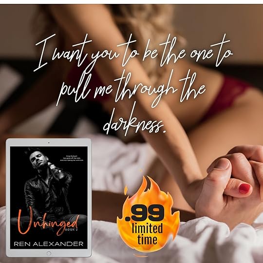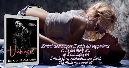 Unhinged continues the story of one of my favorite characters, Greg Rodwell. He leaves Richmond to try and figure out the next step. His fairy godfather, Amos, follows him as well as Simone. I loved this book. I have been rooting for a relationship between Greg and Simone for a while. But in true Ren style, she throws so many twists and turns into this story. There is love, tears, steamy sex, heartbreak, humor and sarcasm as Greg continues to deal with his life. I love Ren Alexander! She is one of my favorite authors who I put right up there with Lora Leigh and Christine Feehan. I can't wait to read whatever she writes next. Please keep writing Ren❤