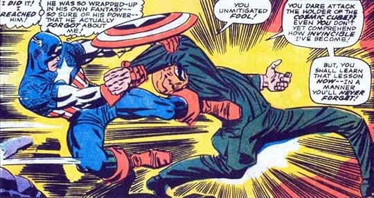 Really been trying to finish all these books I started years ago. I remember putting this one down because it was TOO action packed. Cap lacks any interiority- whenever he's about to get introspective he's attacked by a million jump-suited greco wrestlers. The fight scenes certainly show off Kirby's chops (though they look better in color), but such cardboard dialogue gets a little boring after a while. Guess Stan saved all his good quips for the Fantastic Four and Spider-Man. Anyway, comic book dialogue only really began to evolve when it stopped ending each sentence... with a ellipses... and an exclamation!