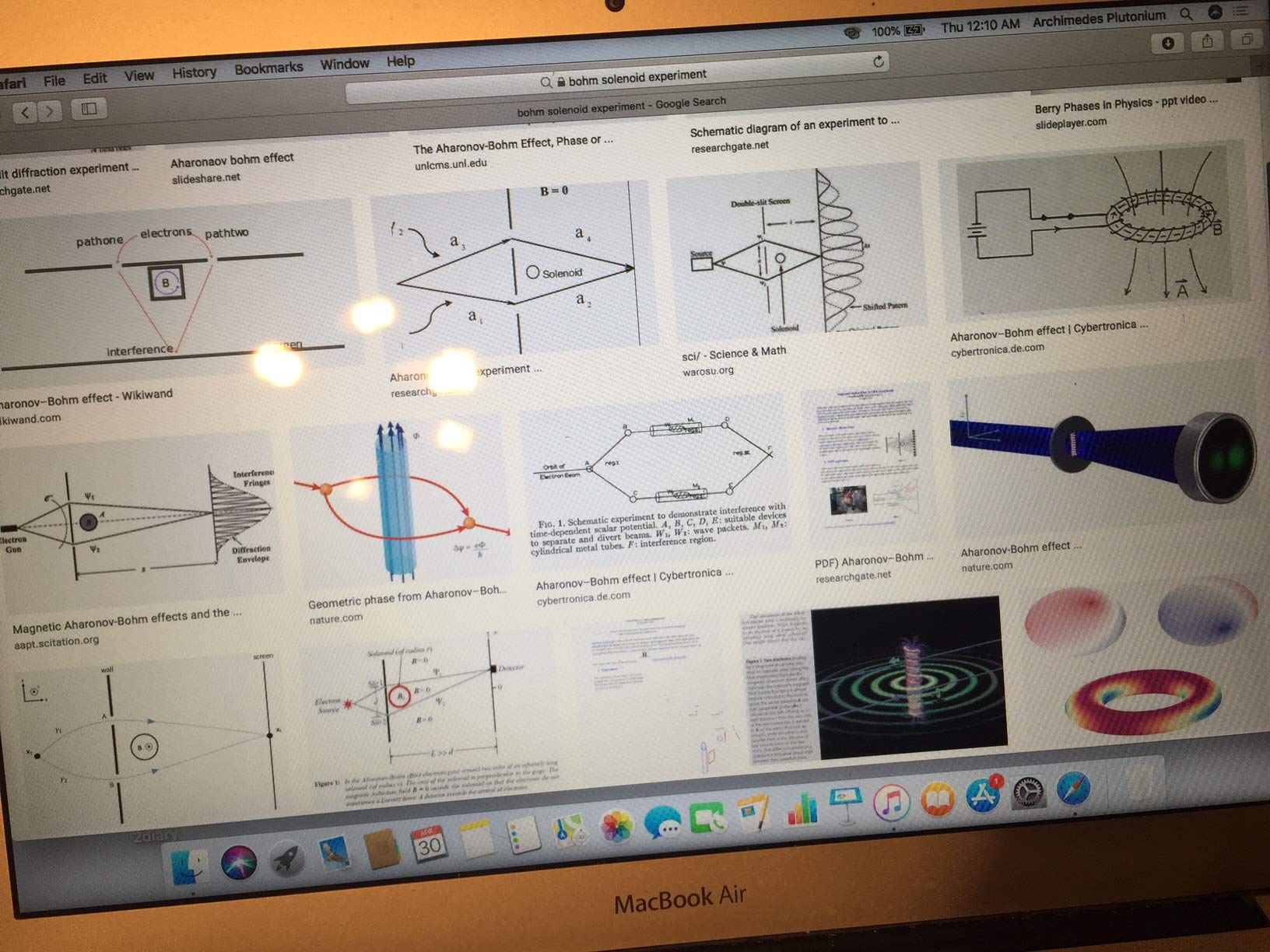 Cover My iphone photo of a Google search for Aharonov-Bohm Solenoid Experiment off my computer. This collection of images are Double-Slit Experiments with a solenoid placed strategically in the experiment set-up.