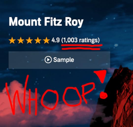 January 14, 2021 An awesome day today as MOUNT FITZ ROY passed 1,000 reviews on Audible. Ray Porter's voice on my words seems to make the listeners happy. What a thrill!