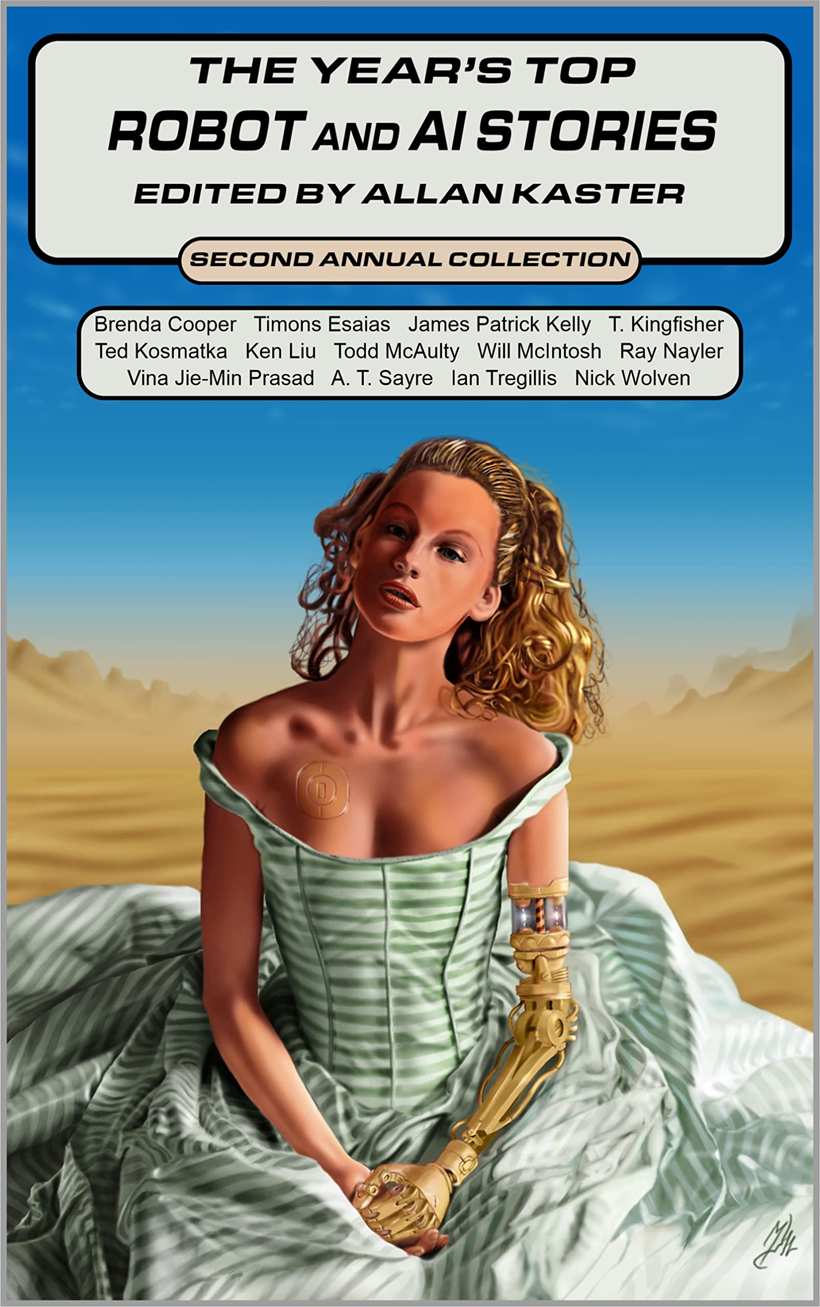 - “Callme and Mink” by Brenda Cooper—A robot that trains dogs tries to find good homes for them in a post-collapse world. - “Go. Now. Fix.” by Timons Esaias—A “Panda Pillow,” programmed to comfort children, finds itself in the middle of an airplane disaster. - “Your Boyfriend Experience” by James Patrick Kelly—A sexbot designer wants his boyfriend to test out his latest android. - “Metal Like Blood in the Dark” by T. Kingfisher — Two space-faring robot siblings, living off sunlight and metal, are captured by an evil drone. - “The Beast Adjoins” by Ted Kosmatka — A woman stranded on a comet schemes to keep her son alive and beat the AIs who have nearly wiped out humanity. - “50 Things Every AI Working with Humans Should Know” by Ken Liu — The obituary for an AI provides a list of advice for other advanced AIs. - “The Ambient Intelligence” by Todd McAulty — A man in power armor confronts a sixty-ton killer robot hiding out in a shipwreck in Lake Michigan. - “Nic and Viv’s Compulsory Courtship” by Will McIntosh — An AI that controls a city sets up an unwilling couple to become “ideal partners.” - “Father” by Ray Nayler — In an alternate 1950s, the VA sends a robot to be a surrogate father to the son of a dead soldier. - “A Guide for Working Breeds” by Vina Jie-Min Prasad — A grumpy robot mentors a perky robot who is having problems with its role in society. - “Rover” by A. T. Sayre — A Martian rover, unable to communicate with Earth, detects a repeating radio signal from a spaceship. - “Come the Revolution” by Ian Tregillis — In an alternate 18th Century Holland, a robot is determined to escape her makers’ constraints. - “Sparklybits” by Nick Wolven — The sole stay-at-home mother of a multi-mom family must come to a gut-wrenching decision about their virus-infected smart home.