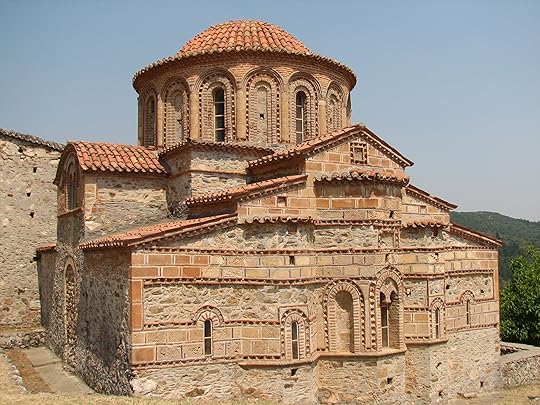 When Nikos Kazantzakis (1883-1957) evokes the Morea, he means that portion of the Peloponnesos formerly ruled by the Franks (and then replaced by the Byzantine Despotate of the Morea). There, where in antique times the Spartans were masters, one can still find the remains of the castles and walled cities of the Franks perched high upon their mountaintops (above is an image of part of the ruins of Mistra). Some of the buildings have been maintained or reconstructed, such as the Agioi Theodoroi: