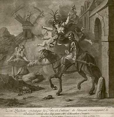 Couple's version of Quijote's meeting with the windmills (episode to which I will return with Doré), cannot drop the inclination to use allegorical figures to express abstract concepts, so we see the flying female figure of Madness and the frivolous Cupid figuring Love as always. Coypel was using the visual language of his times; the one with which he could express himself and the one with which he would be understood. And to us, now, it seems ironic that Coypel resorts to fantasy when illustrating a novel that ridicules overwrought fantasy.