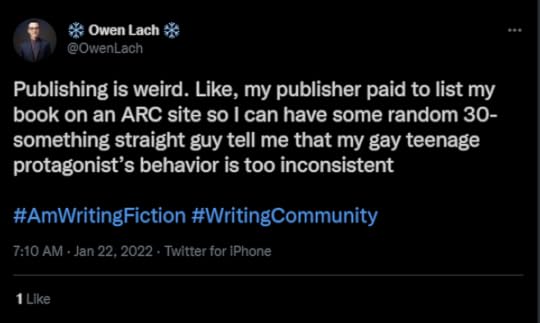What sets this book apart from the traditional dystopian YA sci-fi formula that we all know and love is that the characters have an emotional intelligence that is absolutely refreshing to see, and leads me to encourage school librarians to get this on their shelves. Instead of tension between characters based on miscommunication, poor boundaries, and confusion, we get to see guys sharing their feelings, talking things out, comforting one another, and figuring out trust and romance in an honest way. On top of that, the book features easy use of they/them pronouns, POC representation, and normalized queer romance. I love that it doesn't fall into the "bury your gays" trope. This book was a delight to read, from start to finish, and I'm eagerly anticipating the next installment. Fantastic debut from Owen Lach!