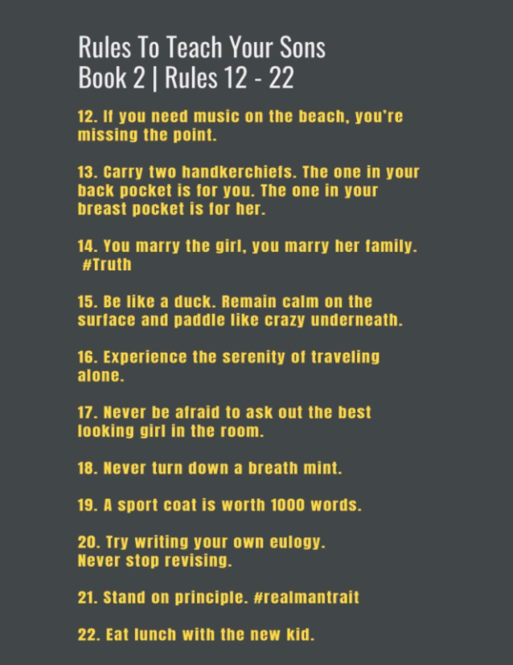 Rules to Teach Your Sons - Rules 12 - 22 | Book 2 of 3 Is a great tool to help parents raise boys. The rules for raising boys are more challenging than ever. So rules 12 -33 of “Rules To Teach Your Sons” are great parenting tips to help train boys. Teaching boys good character establishes a good foundation for success. “Rules to Teach Your Sons” has the rules on the glossy cover of this 8.5 x 11,” college-ruled, 120 page, lined, notebook. Make a copy of the cover to use as a wallposter or as a framed picture on the boys nightstand to keep these character building thoughts in front of your sons.