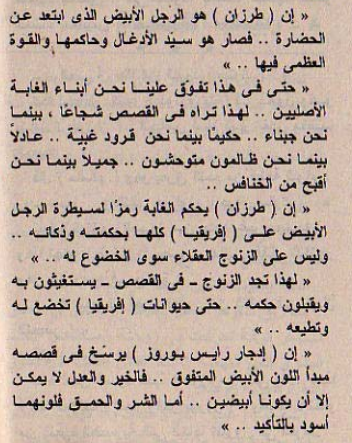 "طرزان الرجل الأبيض الذي ابتعد عن الحضارة فصار هو سيد الأدغال وحاكمها حتى في هذا تفوق علينا،نحن أبناء الغابة الأصليين، لهذا تراه في القصص شجاعا بينما نحن جبناء،ذكيا بينما نحن أغبياء،عادلا بينا نحن ظالمون متوحشون،جميلا بينما نحن أقبح من الخنافس إن طرزان يحكم الغابة رمزا لسيطرة الرجل الأبيض على إفريقيا كلها ، وليس على الزنوج سوى الإطاعة إن إدجار بوروز يرسخ في قصصه،مبدأ اللون الأبيض المتفوق،فالخير والعدل لا بد أن يكون أبيضا،بينما الشر والحمق فلونهما أسود بالتأكيد"