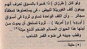 <<تمجيد الرجل الأبيض القوى العادل .. المؤهل ليحكم(إفريقيا) كلها .. وفي كل قصص ( طرزان ) تجدين تجار الرقيق مـن العرب الذين يفسدون في الأرض ويعذبون الزنوج .. وهي محاولة رخيصة لدق(إسفين) ما بين العربي والإفريقي .. وطبعا كلنـا نعرف أن تاجر الرقيق كان هو الرجل الأبيض ، كماحكى (أليكس هيلي) في رواية (جذور) .. ولمزيد من الخداع تجدين (طرزان) يعاقب البيض الأشرار في قصصه .. الحق أن قصص (طرزان) كلها سيئة النية لكنها مسلية جدا .. » ـ « مثلها مثل قصص ( جيمس بوند ) .. » >> .. أعتقد عمري ما هقدر اشوف طرزان زي الأول تاني.
