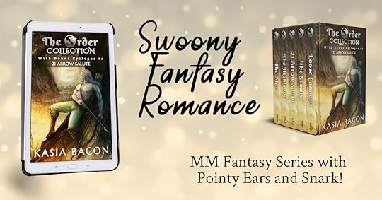 But, getting back to my The Order Collection: With Bonus Epilogue to 21 Arrow Salute review... It was soooooo good to revisit the Dark Elf elite archers: Ervyn and his cousin Verhan and (again) fall in love with their respective partners: the seemingly aloof and rugged Lochan, an elven superassassin; and the sweet and shy redhead, Hernan.